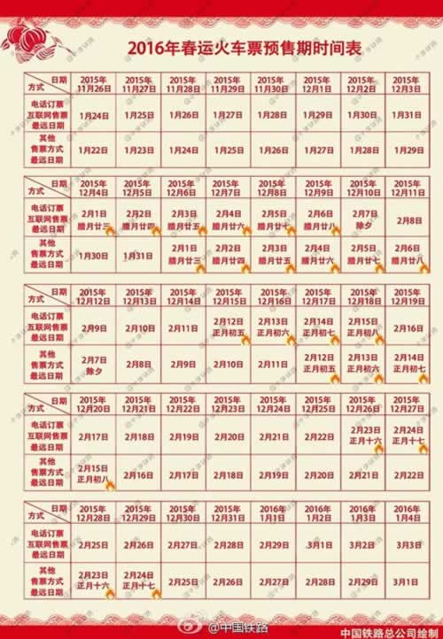 2016年春节(年初一)为2月8日,网络预售票可提前60天购买,所以最快11月26日就可买春运第一天火车票了。要买票的小伙伴要注意啦。