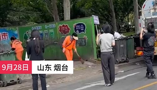 【#山东2名环卫工扫地4人跟拍被指摆拍# 官方:不同部门拍摄内容不同】#官方回应环卫工扫地跟拍被指摆拍作秀# 9月28日,山东烟台招远市府前广场附近,2名环卫工打扫时周围有4人跟拍,被网友质疑是作秀摆拍。