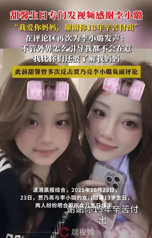 10月23日,李小璐和贾乃亮共同庆祝女儿甜馨生日,甜馨专门发视频感谢李小璐并配文“我爱你妈妈,谢谢你13年辛苦付出。”并再次在评论区为妈妈李小璐发声:“不管外界怎么引导,我都不会在意,我比你们还要了解我妈妈。”