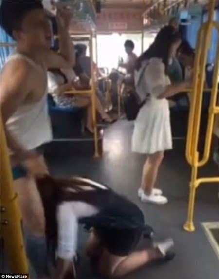 正在行驶的公交车上,女乘客蹲下身捡拾掉在车上的物品;