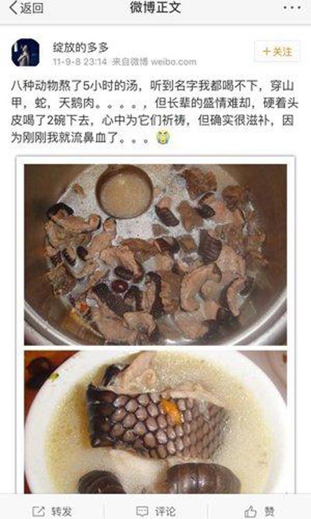 深圳网友绽放的多多多次晒图称食用穿山甲 曾吃太补流鼻血