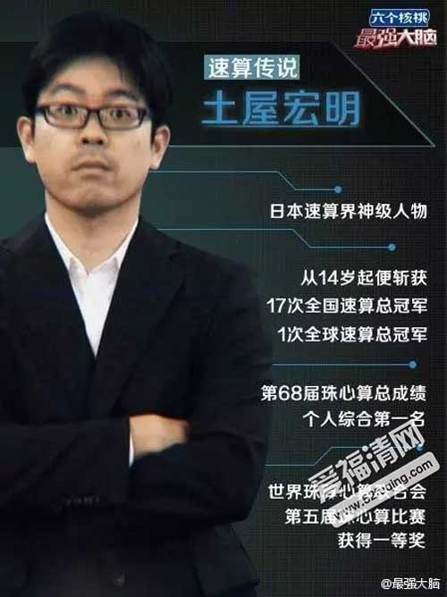 土屋宏明,男,出生于日本,擅长速算。在日本,土屋宏明有着“心算大帝”之称,他包揽了2000至2014年举办的8届“日本心算名人位决定赛”的第一名,在“日本心算选手权大会”中7次夺冠,在2012至2014年获“心算日本冠军大会”第一名,还曾获得过第2届国际心算竞技大会的世界第一。