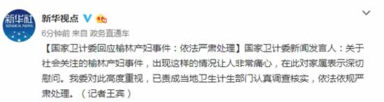 【国家卫计委回应榆林产妇事件:依法严肃处理】国家卫计委新闻发言人:关于社会关注的榆林产妇事件,出现这样的情况让人非常痛心,在此对家属表示深切慰问。我委对此高度重视,已责成当地卫生计生部门认真调查核实,依法依规严肃处理。