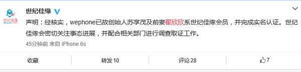 据9月10上午 @世纪佳缘 官微消息:声明:经核实,wephone已故创始人苏享茂及前妻翟欣欣系世纪佳缘会员,并完成实名认证。世纪佳缘会密切关注事态进展,并配合相关部门进行调查取证工作。