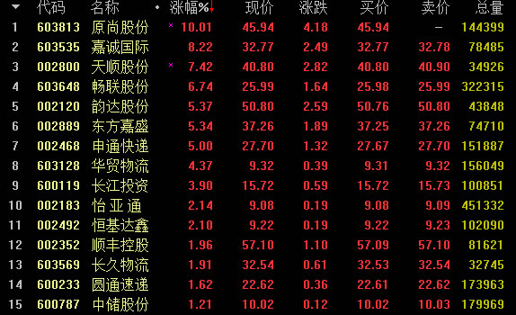 午后,物流板块持续大幅走高。截至发稿,原尚股份涨停,嘉诚国际涨逾8%,天顺股份、畅联股份、韵达股份、东方嘉盛、申通快递等涨逾5%,圆通速递、顺丰控股涨近2%。
