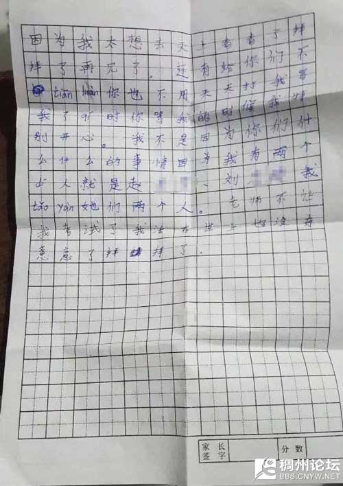 据《新京报》我们视频显示,女孩在去世前疑似留下一则告别视频和两页遗书。遗书中表示“爸妈奶姐弟,当你们看到这封信时我可能已经不在世了”,“我的死不是因为你们也不是因为老师,而是因为我自己”,“你也不用天天打我骂我了,你骂的时候我特别开心”,“因为我太想去天上看看了,拜托了再见了”。