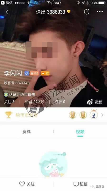 主播“李闪闪”,认证为“绝世暖男”,映客上有32.8万粉丝,微博认证为2016微博直播年度十佳主播。