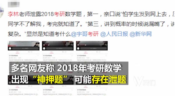 12月26日,多名网友称2018年考研数学出现“神押题”,可能存在泄题。按网友说法,“神押题”的老师为“李林”,他考前押题例题和考研试题很像。有考研学生称,他看了押题视频,觉得百分之八九十类似,视频中也暗示学生“这个题目差不多就是真题”。李林本人称,没有任何泄题,相似题已讲多年,有视频为证。据“中试考研”机构官网信息,李林是该机构数学名师,考研数学大纲制定者之一,但“制定者之一”刚被更新为“研究者之一”。