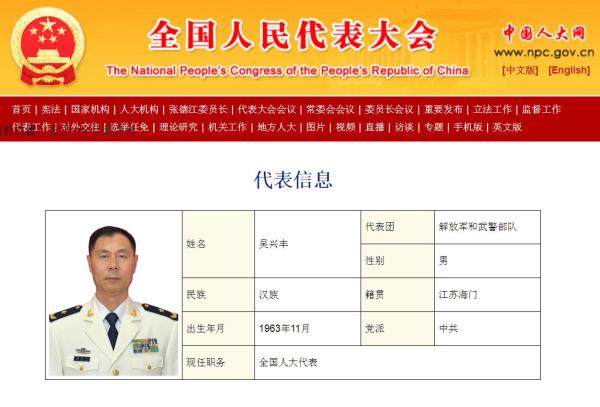 此外,据中国人大网提供的代表信息显示,吴兴丰目前是正军级军官,出生于1963年11月,江苏海门人,海军少将军衔。