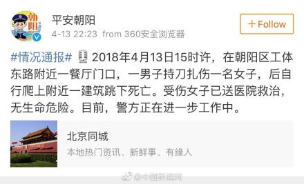 据北京市公安局朝阳分局官方微博@平安朝阳 消息,4月13日15时许,在北京市朝阳区工体东路附近一餐厅门口,一男子持刀扎伤一名女子,后自行爬上附近一建筑跳下死亡。受伤女子已送医院救治,无生命危险。目前,警方正在进一步工作中。