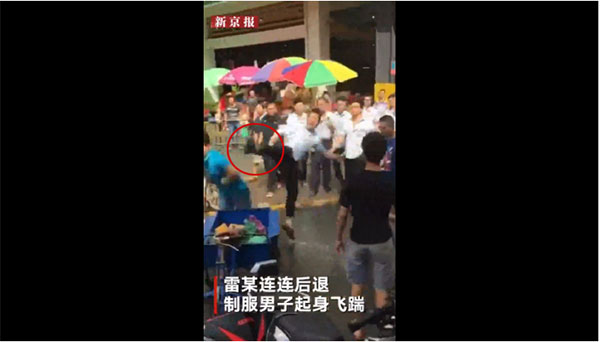 5月16日,广东深圳公明综合市场,商户雷某遭身着制服的男子飞踹。雷某姐姐称,打人者是市场的管理人员。当天因将电动车停放在消防通道内,管理人员提醒后,生意较忙忘记推走。随后管理人员要将车辆收走。雷某不服气,便和管理人员起了争执。公明综合市场管理办表示,确有此事,但是是雷某先动手。