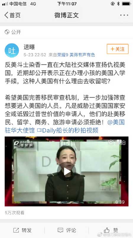 @速曝:反美斗士染香一直在大陆社交媒体宣扬仇视美国,近期却公开表示正在办理小孩的美国入学手续,这种人美国有什么理由去收留呢?