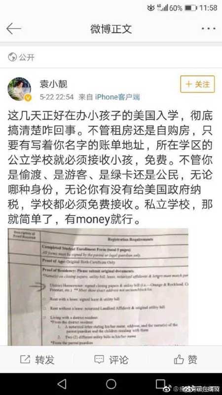 前天(5月22日),袁小靓(原爱国大V染香同志)移居美国,微博晒孩子在美入学经历。袁小靓称:这几天正好在办小孩子的美国入学,彻底搞清楚咋回事。不管租房还是自购房,只要有写着你名字的账单地址,所在学区的公立学校就必须接收小孩,免费。不管你是偷渡、是游客、是绿卡还是公民,无论哪种身份,无论你有没有给美国政府纳税,学校都必须免费接收。私立学校,那就简单了,有money就行。