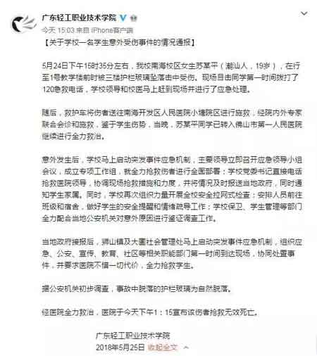 (副标题:广东轻工职业技术学院一女生被坠落的玻璃砸中身亡)