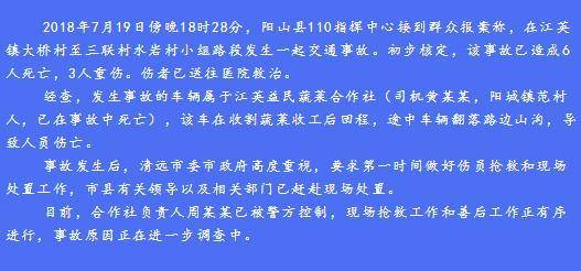 2018年7月19日傍晚18时28分,阳山县110指挥中心接到群众报案称,在江英镇大桥村至三联村水岩村小组路段发生一起交通事故。初步核定,该事故已造成6人死亡,3人重伤。伤者已送往医院救治。