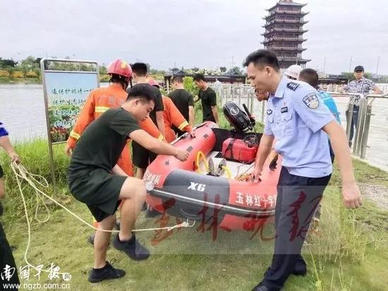 不久,园博园工作人员、消防、蓝天救援队先后赶到现场。园博园工作人员通过冲锋舟进行救援。