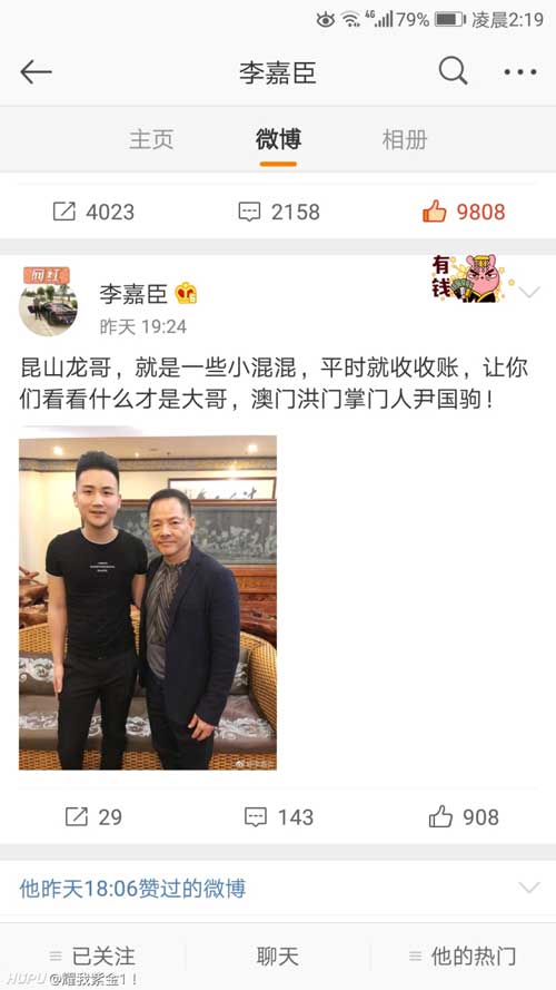 李嘉臣微博自曝与澳门洪门掌门人尹国驹照片并称:昆山龙哥,就是一些小混混,平时就收收账,让你们看看什么才是大哥,澳门洪门学门人尹国驹!