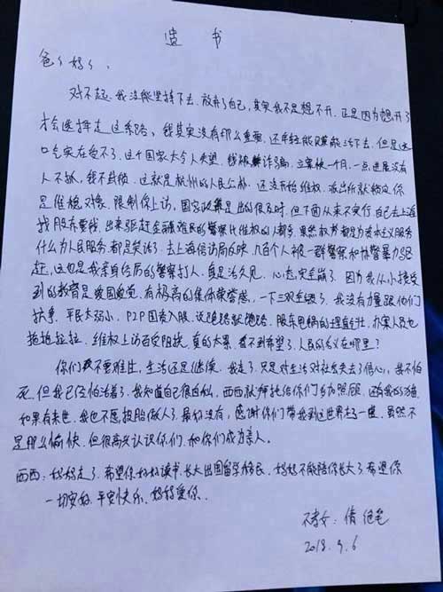 你们不要难过,生活还是继续。我走了,只是对生活对社会失去信心,我不怕死,但我已经怕活着了。我知道自己很自私,西西就拜托给你们多加照顾,还有我的猫。如果有来世,我也不愿投胎做人了,最好没有。感谢你们带我到这世界走了一趟,虽然不是那么愉快,但很高兴认识你们,和你们成为亲人。