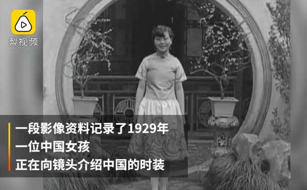 一段影像资料记录了1929年一位中国女孩向镜头介绍中国的时装。她穿着一条精致的短袖及膝连衣裙,并说道:“时髦的中国女孩将东西方的时尚结合。”有趣的是,介绍过程中,她还因为忘词而捂嘴笑场。