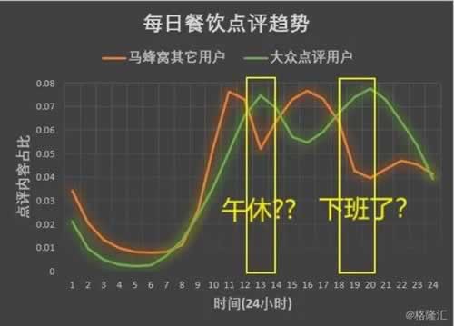 再看一张图,每日餐饮点评数量趋势,大众点评是在午饭和晚饭活跃。对吧,人之常情嘛,吃完饭抒发一下