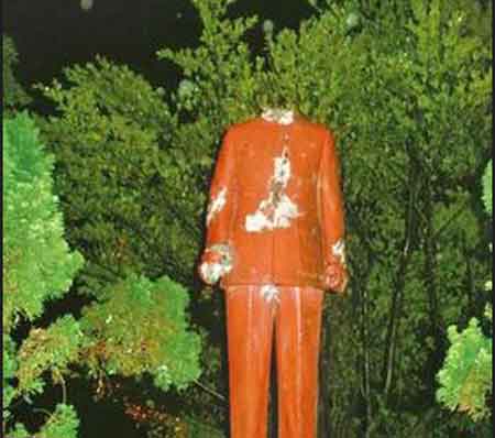 图片中的内容是1名男子拿着一把类似刀具,指着已经放在地上的蒋介石铜像头颅,另一张则是头颅摆在铜像的脚边,手法与“IS”的手法相似。记者昨晚抵狮球岭上,发现蒋介石铜像遭断头、脚跟、右手,果真身首异处。