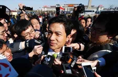 3月3日,全国政协十二届三次会议在北京开幕。全国政协委员李彦宏入场时记者围堵采访。 中新社发 富田 摄