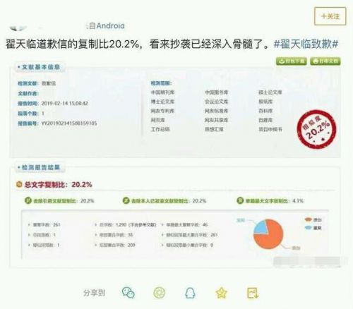 网易娱乐2月14日报道 14日,翟天临发布致歉声明,道歉信中,他言辞恳切,并表示深刻反思懊悔不已,愿意积极配合北电一切调查,向影响到的相关论文作者致歉,将退出北大博士后科研流动站的相关工作。然后随后,有网友再次扒出翟天临所发道歉信竟然有超过20%的复制比例。