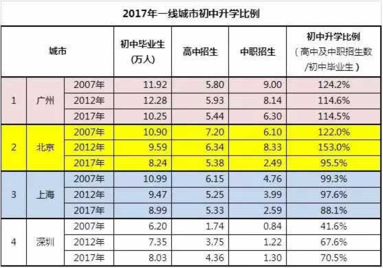 接下来我们来进行第二个指标的比较,初中毕业生的升学率。这里我先说明一下:小学升初中,在这些地区基本上都是百分百的升学率,毕竟乃是义务教育,教育部门除非不让人家入小学,一旦入学,就必须保证升初中。然而初中之上的教育就不再是义务教育,就有财政上的投入和倾斜问题了。下表依然是按优劣排序,依次是:广州、北京、上海和深圳。