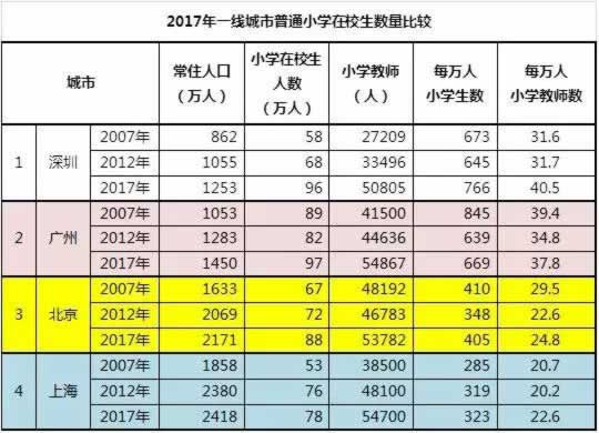 首先我要拿出来比较的,是小学教育。注意,我这里主要是比较两个主要数据:小学生人数和小学教师数。下面的排名分先后,是按照北上广深四个城市的小学教育资源的充沛程度进行的排名。先后顺序依次是:深圳、广州、北京和上海。