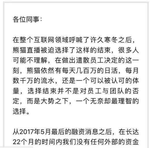 从2017年5月最后的融资消息之后,在长达22个月的时间内我们没有任何外部的资金注入,管理层在过去两年时间中不断的尝试,极尽努力寻找了至少5个潜在的投资方,和多种方案,遗憾的是最终没有解决掉资金的缺口。作为直播平台,熊猫的运营需要负担高昂的带宽以及众多主播的高额工资,整个行业在追求赢利的路上都在踯蜀前行,当我们为了做到收支平衡不断缩小自身之后,新的融资仍然无法到位,在当前的投资环境以及垂直领域的不断恶化的情况下,熊猫的空间在不断缩小,当坚持都成了某种程度的消耗,我们无法对所有的努力一—致歉。我们有优秀的团队,有天赋的主播,很多依然陪伴我们前行的合作伙伴,相信我们的团队,我们的伙伴,都能在接下来的时间里有更好的空间展现自己,这段时光永远记录着大家的努力。