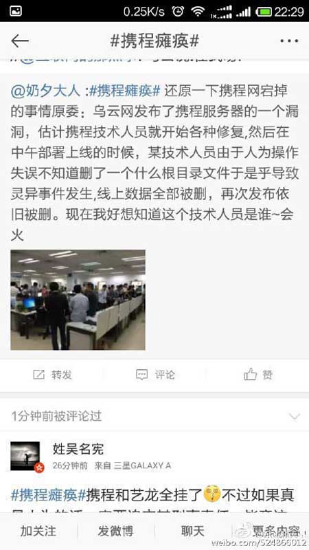 如果是这种情况的话,问题就真大了。数据删除有逻辑删除和物理删除两种,逻辑删除的文件容易恢复,而物理删除则很难恢复!也就是说,如果真是物理删除,携程就真是出大事儿了。这个流言,也在微博上得到了侧面验证。