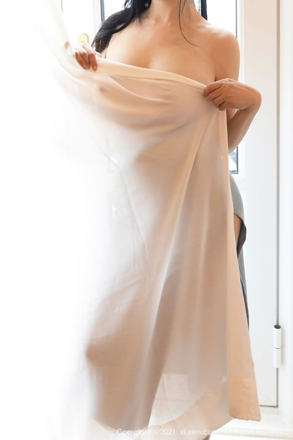女模@允爾轻透蓝长裙包裹下凹凸有致的好身材