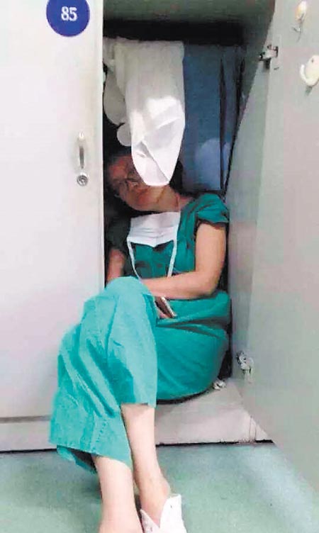 昨日,记者来到该院妇二科,由于患者十分多,蒋丹没时间接受记者的采访。该科护士长黄伟透露,7月1日,蒋丹在临近中午时主刀了一台宫外孕急诊手术,在手术室这种精神承受高压、精力需高度集中的工作环境下,两个半小时的手术,让她疲惫不堪。尽管很想躺下来休息,但是下午还有一台手术在等待着她,只能利用手术之间的间隔,在衣柜里打个小盹儿。